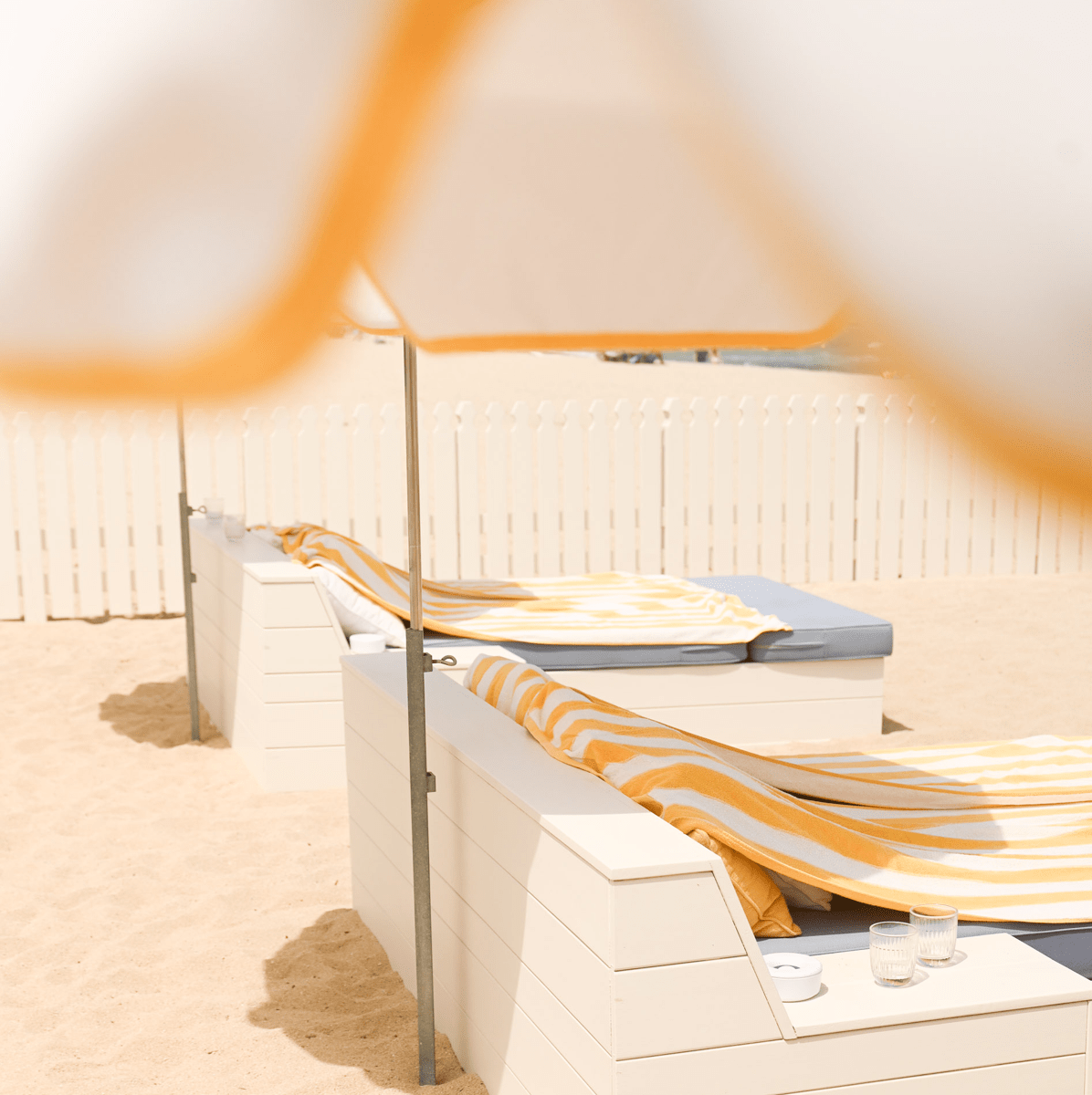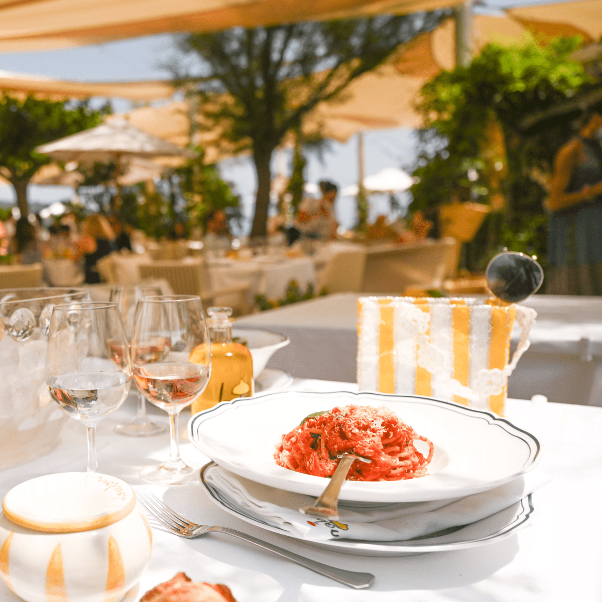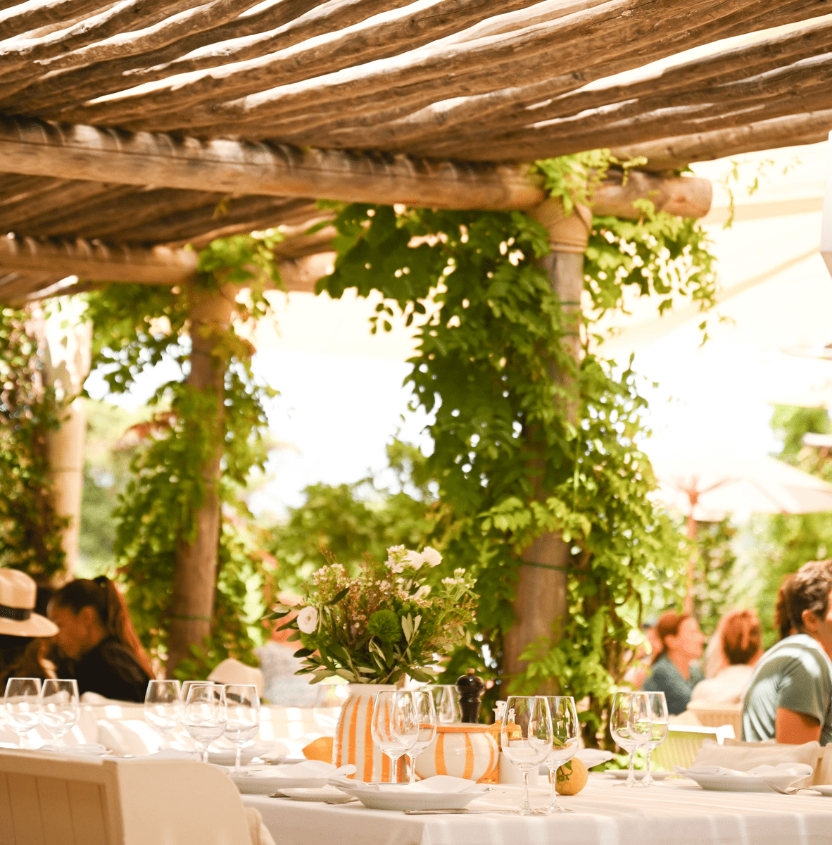 Amarrée sur la mythique plage de Pampelonne, la maison de vacances de Loulou vous transporte entre Capri et les Hamptons. Immergées dans la végétation, entre tamaris, oliviers et citronniers odorants, les tables juponnées de nappes immaculées paradent devant la Grande bleue pour offrir une parenthèse enchantée. De la plage au restaurant, Loulou reçoit ses amis avec gaieté et légèreté.